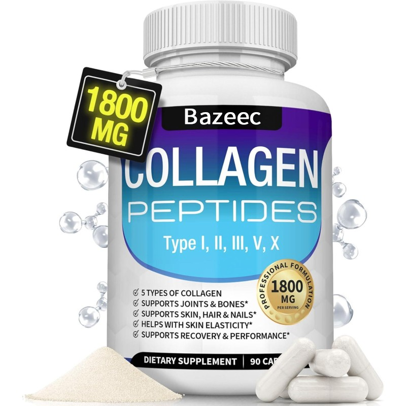 Bazeec™ Multi Collagen Peptides Pills 1800 Mg Complex is a powerful blend designed to support your skin, joints, and overall well-being. Packed with five types of collagen (Types I, II, III, V, X), it helps maintain skin elasticity, joint flexibility, and bone strength. Enhanced with hyaluronic acid, biotin, and vitamin C, it promotes skin hydration, hair and nail health, and collagen synthesis. With its unflavored formula, it's easy to incorporate into your daily routine. Revitalize your beauty from within and support your body's foundation with our premium collagen powder.